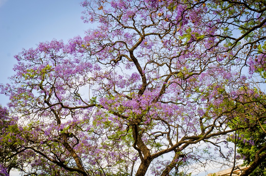 Chega a esta altura e Lisboa fica assim, lilás, e quando estas flores caem no chão apercebemos-nos melhor da beleza que tiveram durante este período. É mais comum olharmos para o chão enquanto passamos, a olhar para o telemovel, a fazer contas, a fazer a lista do supermercado, a lista do que está por fazer em casa, a lista das graçinhas dos miúdos que queremos partilhar com a família no domingo e lá em cima está um céu azul a contratar com o lilás das arvores Jacarandás que habitam por essas avenidas. Só tive tempo para estas fotos, enquanto prometia à minha filha que ia à procura dum corneto de morango (e o ia encontrar, isto porque na Baixa não é o mais fácil de se achar) e estava eu num largo que no ano passado me ficou apenas na cabeça, cheia de esperança desta vez fixar o momento com a minha máquina mas desta vez encontrei um largo em obras(costumeiras, longas e geralmente paradas obras) e só me apeteceu olhar para o ceú.